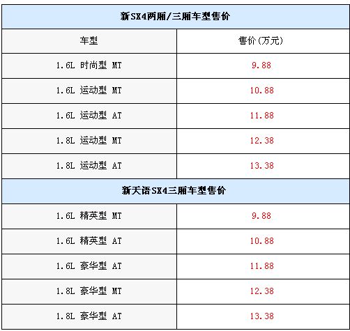 2009年3月10日,長安鈴木新款SX4車型上市。此次上市的新車共有1.6L和1.8L兩個(gè)排量,其中1.8L為新增車型。新款SX4兩廂/三廂車型各推出5款車型,共計(jì)10款,售價(jià)區(qū)間為9.88~13.38萬元。同時(shí),長安鈴木宣布,購買新增天語SX4 1.8L車型將獲贈(zèng)50%的購置稅補(bǔ)貼,享受與 1.6L車型同等的購置稅優(yōu)惠,讓購車者得到更多的實(shí)惠。具體車型售價(jià)如下: