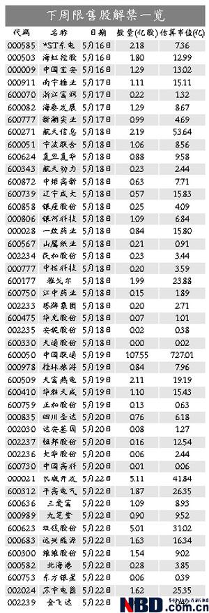 下周將有涉及46家公司解禁,中國聯(lián)通5月19日將有107.55億股限售股解禁,占下周總解禁量的70.92%,占該股流通股本的102.99%。不過持有中國聯(lián)通限售股為公司大股東,業(yè)內(nèi)人士稱其幾乎不會有減持壓力,即使股價再大幅上漲,大股東套現(xiàn)的可能性也不大。而雙錢股份、長城開發(fā)下周限售股解禁量占其流通股本比重超過100%,解禁壓力較大。