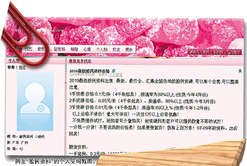 有人在網(wǎng)上發(fā)布叫賣(mài)廣告,有人在博客上叫賣(mài),有的人在個(gè)人QQ空間里叫賣(mài),更多的人則在一些網(wǎng)站上反復(fù)發(fā)帖叫賣(mài)。甚至有一個(gè)專(zhuān)門(mén)的“股民信息吧”,討論股民信息。這些網(wǎng)頁(yè)都宣稱(chēng),他們掌握的資料“最新”、“最準(zhǔn)確”、“來(lái)源權(quán)威”。