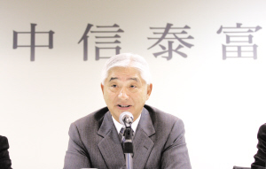 中信泰富有限公司25日公布,由于外匯合同所導(dǎo)致的變現(xiàn)及市場(chǎng)公允值的稅后虧損對(duì)公司溢利造成嚴(yán)重影響,中信泰富去年稅后股東應(yīng)占凈虧損為126.62億港元。董事會(huì)建議不派發(fā)末期股息,因此全年每股派息為中期股息的0.3港元。另外不派給董事們2008年全年的花紅。圖為榮智健在業(yè)績(jī)發(fā)布會(huì)上。