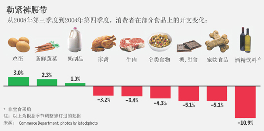 美國(guó)消費(fèi)者已經(jīng)大幅削減了食品開(kāi)銷(xiāo);他們正避免出外就餐,選擇普通廉價(jià)產(chǎn)品,喝自家煮的咖啡,購(gòu)物時(shí)找便宜貨。在這種消費(fèi)勢(shì)頭的沖擊下,許多食品加工商、雜貨連鎖店和餐館的生意和利潤(rùn)都出現(xiàn)了下滑。