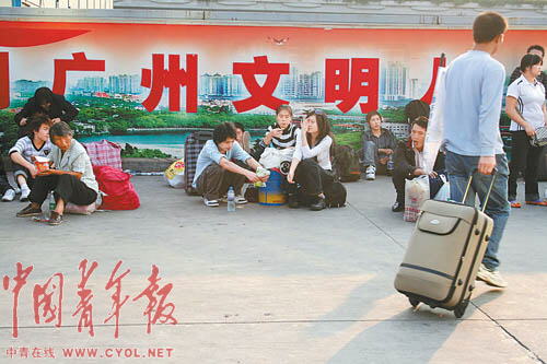 2月6日,正月十二。春節(jié)期間侵襲珠三角的寒潮剛剛過去。廣州火車站門前的廣場上,到處是肩挑背扛、行色匆匆的旅客。還有很多人散坐在廣場上,等待回鄉(xiāng)或者進入珠三角腹地。