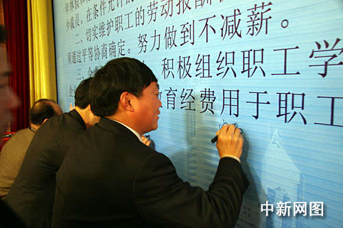 記者在現(xiàn)場看到,《共同約定書》中企業(yè)方的承諾主要是:企業(yè)依法采取縮短工時,適時安排年休假和特別休假、輪崗輪休等形式保障職工崗位,做到不減薪、不裁員或少裁員。企業(yè)要組織職工學習新技術(shù),而且企業(yè)教育經(jīng)費用于職工培訓不少于70%。另一方面,職工方作出了立足本職、愛崗敬業(yè)、積極為企業(yè)發(fā)展獻計出力等承諾。