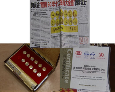 最近,北京多家知名媒體刊登大幅廣告,以著名書(shū)畫(huà)大師范曾的名義推銷純黃金“建國(guó)60年十二生肖大全套”,廣告中不僅聲稱耗用了68.6克純黃金鑄造了12枚純金生肖和巨幅畫(huà)卷,同時(shí),還宣稱這是中國(guó)金幣史上第一套“建國(guó)十二生肖”的大全套。
