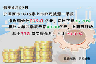 據(jù)天相投資顧問公司的統(tǒng)計(jì),截至4月27日,滬深兩市共1421家上市公司披露了年報(bào)。其中,1238家公司去年實(shí)現(xiàn)盈利,占比87.12%。已披露年報(bào)公司去年凈利潤合計(jì)7666億元,較上年同期下降15.88%。