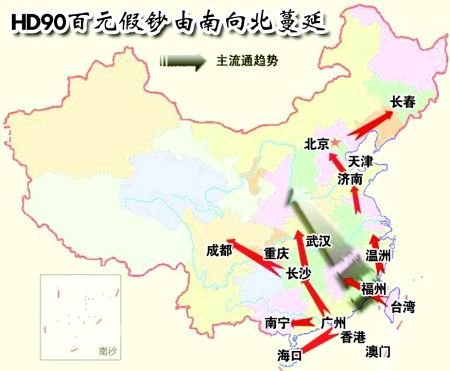 1月8日,央行就此事在北京召開記者招待會(huì),央行貨幣金銀局局長(zhǎng)葉英男澄清了HD90版假幣“高仿真”的傳言。部分城市的警方已經(jīng)就假幣事件立案調(diào)查。然而,透過(guò)沸沸揚(yáng)揚(yáng)的假幣風(fēng)波,人們不禁要問(wèn),如此大規(guī)模的假幣事件頻發(fā),背后是怎樣一只無(wú)形的黑手?一條由南向北、自東向西的假幣蔓延路徑,漸漸浮出了水面……