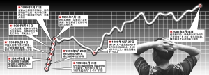 199年的5·19前夕,深滬股市再次探底,上證綜指創(chuàng)出1047.83點的階段新低,許多市場中人都為大盤可能擊穿1000點而憂慮。當年5月19日,在沒有任何利好刺激的情況下,在中信國安、廈門信達等網(wǎng)絡科技股的帶動下兩市大盤走出放量上漲的行情,并連續(xù)4日大幅上漲,漲幅超過20%,就這樣,一輪井噴式的上漲行情就在投資者毫無準備下展開了。