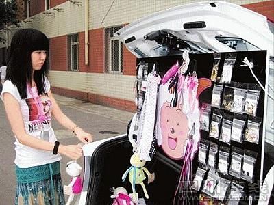 在張?jiān)臄偽粌蛇叄亟滞V涣锼郊臆。捷達(dá)、塞納、帕薩特,甚至還有顏色鮮艷的現(xiàn)代跑車和寶馬MINI。每輛車旁都擺著自家的攤位,服裝、鞋帽、飾品、化妝品、文具等等琳瑯滿目。