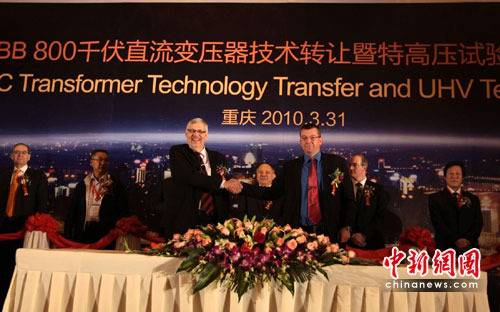 中新網(wǎng)重慶3月31日電(記者 郭虹)31日,位居全球500強(qiáng)之列的電力和自動化技術(shù)領(lǐng)域的廠商ABB集團(tuán)在渝簽署協(xié)議,將800千伏高壓直流變壓器技術(shù)轉(zhuǎn)讓給其在華企業(yè)——重慶ABB變壓器有限公司;同時(shí),ABB特高壓試驗(yàn)中心亦在此落成。