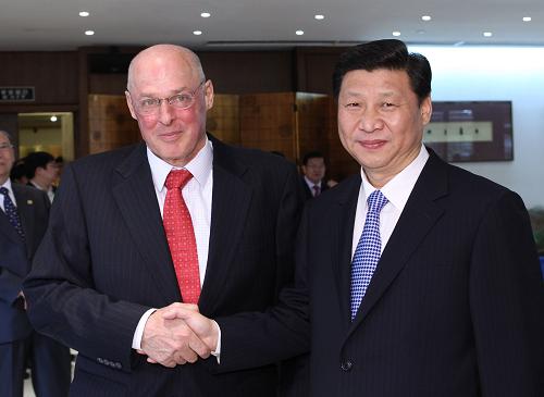 在會見保爾森時,習近平說,中美都是世界上有重要影響的國家。在推動世界經(jīng)濟復蘇和可持續(xù)增長、處理國際和地區(qū)熱點問題以及維護世界和平與安全等方面,中美兩國擁有廣泛的共同利益,肩負著重要責任。中方一貫高度重視中美關系,愿與美方共同努力,尊重彼此核心利益和重大關切,妥善處理分歧和敏感問題,加強各領域對話、交流與合作,推動中美關系沿著積極合作全面的軌道向前發(fā)展。習近平深入闡述了中方在中美經(jīng)貿(mào)關系、人民幣匯率等問題上的原則立場,期待保爾森繼續(xù)發(fā)揮影響力,為促進中美在經(jīng)濟金融領域的對話合作和后國際金融危機時期兩國經(jīng)濟關系健康穩(wěn)定發(fā)展發(fā)揮積極作用。