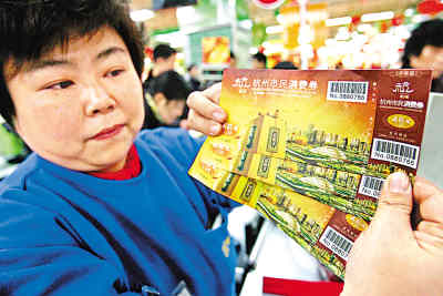 據(jù)杭州市貿(mào)易局統(tǒng)計(jì),消費(fèi)券使用以超市為主。有關(guān)人士分析,因?yàn)槭忻耦I(lǐng)到的消費(fèi)券多在幾百元,買太貴的東西也不合算,所以超市的食品、滋補(bǔ)品最受青睞。