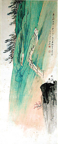 此外,張大千描繪華山長空棧道險峻奇崛的《華山行》,以145.6萬元成交。張大千于1935年游浙江莫干山、洛陽龍門及西安、華山,并為此舉辦了“關(guān)洛紀游畫展”,《華山行》即創(chuàng)作于此時。在似青綠山水卻又色不重的大片綠中,畫一長空棧道,著以赭色,十分醒目?諚I隙它c兩游者,相背、扶壁而立,一者小心看風(fēng)景,似不敢再往前;一者已有悔意,正想返身而下,這正應(yīng)和了畫面的款識“予每度來游,皆中道而返”,或許是大千自己的寫照吧。