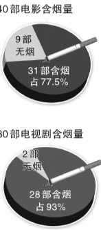 從2007年開(kāi)始,中國(guó)控?zé)焻f(xié)會(huì)每年都會(huì)對(duì)熱播的國(guó)產(chǎn)影視劇中的吸煙鏡頭進(jìn)行監(jiān)測(cè)統(tǒng)計(jì)。對(duì)2009年熱播的40部電影和30部電視劇進(jìn)行的監(jiān)測(cè)結(jié)果顯示:在40部電影中有9部電影完全沒(méi)有煙草鏡頭,31部影片有煙草鏡頭,占影片的77.5%;30部電視劇中,2部沒(méi)有煙草鏡頭,28部有煙草鏡頭,占電視劇比例的93%。
