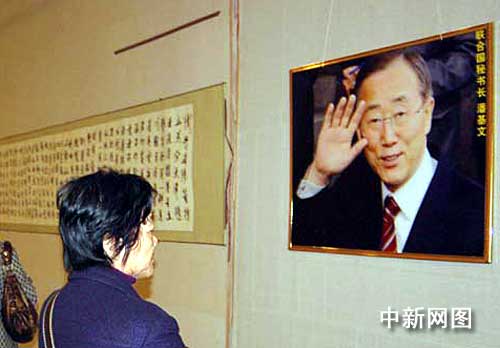中新網(wǎng)南寧1月11日電(記者 劉萬(wàn)強(qiáng))聯(lián)合國(guó)秘書(shū)長(zhǎng)潘基文“亮相”中國(guó)廣西博物館正在舉行的2009年潘氏迎春書(shū)畫(huà)藝術(shù)作品展上,在該項(xiàng)展覽中,潘基文作為潘氏名人,他的兩幅照片被掛在展廳內(nèi)的顯著位置。