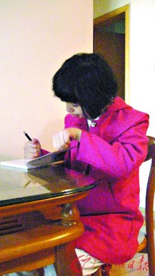 淡粉色毛衣、棗紅色外套、白色褲子、可愛的娃娃頭短發(fā),瘦小的陳楠看起來像是一名中學(xué)生。盡管她每邁一步就要停下一會調(diào)整步伐,但當(dāng)記者走進她家時,她還是熱情地起身到門口迎接。雖然說話比較費力,吐字也并不清晰,但她的思維和反應(yīng)都很快,她會側(cè)仰著頭仔細(xì)傾聽你的問題,然后迅速接下話茬,努力嚅動嘴唇發(fā)音,說到興起之處,她還會像個孩子般發(fā)出爽朗的笑聲!拔易畲蟮膲粝刖褪钱(dāng)個作家,不過還真沒想到在25歲時就能出書呢!