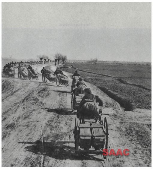 12.淮海戰(zhàn)役中,中原人民支援我軍彈藥、物品的架子車隊