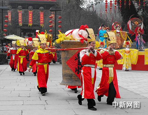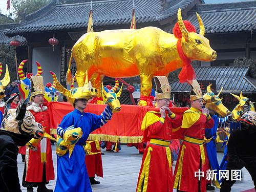 在杭州宋城景區(qū),記者看到,俏皮可愛的芒神手執(zhí)神鞭向一頭碩大的金牛揮去。每抽出一鞭,便引來圍攻群眾歡呼雷動。身穿九龍絳紗袍的大宋皇帝手執(zhí)高香,引領文武百官、后宮嬪妃登壇祭拜,一步一停,口中念念有詞;繼而,臺下上百位演員裝扮各路神仙載歌載舞,鞭炮鼓樂響徹云霄……這便是2009年杭州宋城景區(qū)的主打民俗演出“鞭打春!钡膲延^場景。