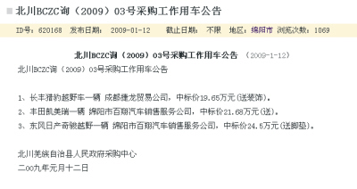網(wǎng)友在《北川政府110萬采購豪華越野車》的帖子中,展示了一張名為“北川采購工作用車中標公告”的截圖,而韓寒在其博客里引用“來自綿陽政府采購網(wǎng)”的資料,列舉綿陽購買的10萬余輛車一覽,所有越野車的價格都在10萬到100萬之間。其中有長豐獵豹、東風日產(chǎn)奇駿、豐田普拉多等10萬以上的越野車,價格在50萬以上的車就有4輛,其中就有豐田普拉多VX4.0導航版,價格62.60萬元。另外還不乏像蘭德酷路澤頂配這樣的百萬豪車,所有車的總價值超過400萬。