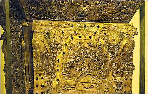 記者了解到,塔王被請出后的第一件事就是“擦澡”,專家用蒸餾水、棉花在塔王的表面一點(diǎn)點(diǎn)地擦洗,如今,凡是見過它的專家都會(huì)驚艷,去除蒙塵的塔王散發(fā)出金色的光澤,表面布滿了大大小小的雕刻圖案,如果加上20多幅故事圖畫上的人物,阿育王塔佛像人物像共超過了100個(gè),舉世罕見。其中,佛祖釋迦牟尼生平故事以連環(huán)畫的形式雕刻在8片山花蕉葉上,每片上有2-3個(gè)故事,共約20幅圖案分別描述了六牙白象入夢、佛祖誕生、菩提樹下證道、佛祖涅槃等20個(gè)故事。