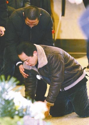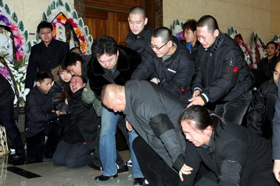 上午7點44分,德云社內(nèi)部的吊唁活動率先進行。郭德綱、王惠夫婦,于謙、王海、李菁、何云偉、曹云金等骨干演員率百名演職人員向張文順先生的遺體默哀,禮畢后人人號啕大哭,痛不欲生。雙眼紅腫、哽咽不斷的郭德綱嘆息說,張先生走得太早了,自己失去了一位摯友,他愿老人能夠在天享福,歡笑來生。郭德綱承諾會照顧張夫人,并用心培養(yǎng)張文順的外孫寧云祥在德云社說好相聲。