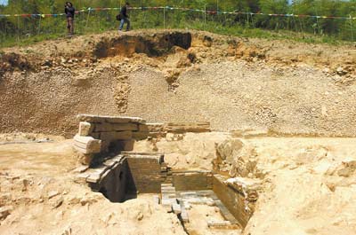 汪大猷墓位于余姚市大隱鎮(zhèn)下磨村后山。記者昨天趕到現(xiàn)場(chǎng),老遠(yuǎn)看到一座山,幾乎半個(gè)面都被開掘出來(lái),相當(dāng)壯觀。沿著泥沙路往上走,路慢慢地變窄。不一會(huì),前方出現(xiàn)一條亂石鋪成的道路。參與此次考古發(fā)掘的考古隊(duì)隊(duì)員羅鵬告訴記者,這是墓前的神道,以前神道兩旁各有對(duì)稱的石羊、石馬、石虎和石人4對(duì)石像生。不過年代久遠(yuǎn),其中幾座遭到損壞,現(xiàn)尚有4座保存在村民家中。記者眼前只見磚頭搭起的基座。
