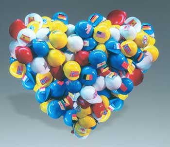 構(gòu)思不同、表達(dá)多樣的100多件雕塑,從不同角度展現(xiàn)了地震中人性的堅(jiān)強(qiáng)與抗?fàn)。如燕山大學(xué)藝術(shù)學(xué)院教師吳新的浮雕作品《我們的畢業(yè)照》,展現(xiàn)的是一張老師缺席的畢業(yè)照,作者為地震中老師的犧牲精神所感動(dòng),并期望將這種感動(dòng)傳達(dá)給觀眾。西安美術(shù)學(xué)院雕塑系教授周曉東的作品《茂汶蘋果》,雕刻了一個(gè)特殊的蘋果,裂了口的蘋果上描繪了重建后的家園圖。他說,是四川人都熟知的汶川和茂縣的土特產(chǎn)蘋果給了他表達(dá)的沖動(dòng)。親自去過災(zāi)區(qū)的周曉東深深地體會(huì)到地震中人們的心理障礙,“許多人根本無法面對(duì)親人的忽然離去!彼运敢庥脴酚^的蘋果去感染人的情緒,讓他們感受到生的希望,因?yàn),比自然?zāi)難更可怕的是人的絕望。天津美術(shù)學(xué)院學(xué)生韓帥、宋曉燕、李鵬共同創(chuàng)作的作品《關(guān)愛》,將貼有各國(guó)國(guó)旗的五彩安全帽組合成心形,既使觀眾重溫了國(guó)際救援愛心行動(dòng)帶來的希望與感動(dòng),也不禁為“80后”藝術(shù)家的巧妙構(gòu)思而叫好。