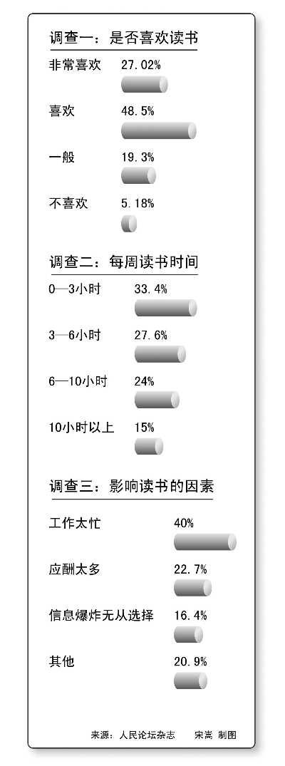 為了解干部讀書現(xiàn)狀,人民論壇雜志社近日在全國范圍內(nèi)組織了“萬名黨政干部閱讀狀況調(diào)查”。結(jié)果顯示,七成多的黨政干部讀書的愿望強烈,但由于工作忙、應酬多等原因,33.4%的受訪干部每周的讀書時間為0—3小時,27.6%為3—6小時。
