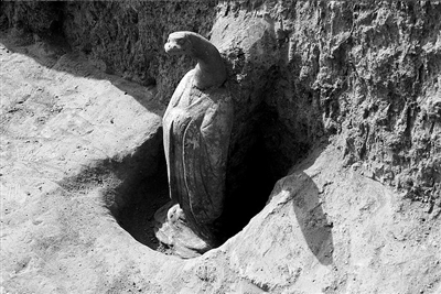 根據(jù)目前的考古資料,兩京(長(zhǎng)安、洛陽)地區(qū)唐墓中所見最早、最完整的一組十二生肖俑出土于西安南郊開元二十四年(736年)唐兵部常選孫承嗣和夫人高氏合葬墓,俑高約25厘米。十二生肖俑在初唐晚期和盛唐時(shí)代墓葬中時(shí)有發(fā)現(xiàn),但在墓葬圍溝中出土卻極為稀見,這可能代表著更高級(jí)別的一種喪葬制度?脊艑<艺J(rèn)為,西安咸陽機(jī)場(chǎng)考古工地這次發(fā)現(xiàn)的十二生肖俑群組合基本完整,體量巨大,造型優(yōu)美,出土位置明確,是一組研究唐代喪葬制度和雕塑藝術(shù)不可多得的珍貴資料。