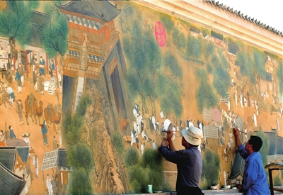 經(jīng)過近倆月的努力,昨天,在延慶大榆樹鎮(zhèn)奚官營(yíng)村,一幅由4名農(nóng)民畫家集體創(chuàng)作的《清明上河圖》壁畫終于落成。村委會(huì)表示,將在村里其他角落繪制壁畫,打造“亞洲第一壁畫村”。