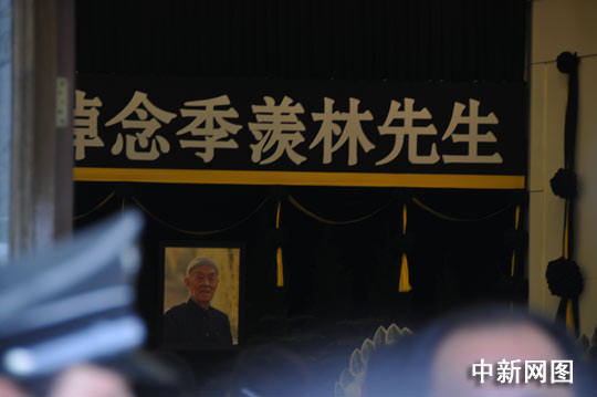 中新網(wǎng)7月19日電(張中江) 著名國學大師季羨林先生的遺體告別儀式19日上午在北京八寶山革命公墓東禮堂舉行。靈堂的上方懸掛著黑底白字的橫幅“沉痛悼念季羨林同志”,橫幅下方是頭戴絨帽、身穿藍色中山裝的季老遺像。