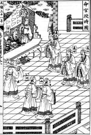 制定歷法,就是“觀象授時”,對統(tǒng)治者來說是最重要的事情。天文歷法象征著帝王“君權神授”的統(tǒng)治權威。傳說堯帝就命天文學家羲、和二氏進行天文觀測以制定歷法。《尚書·堯典》說:“乃命羲和,欽若昊天,歷象日月星辰!碑敃r是以觀測日出方位和黃昏時中天的恒星來確定季節(jié)。根據書中記錄的“中星”天象,可以推斷堯帝“觀象授時”的年代約在公元前23世紀。當時制定的歷法是一年有366天,以置閏月的方法保持與季節(jié)同步。