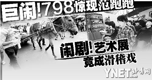 太多的意外使首屆798雙年展更像是一臺鬧劇,可諷刺的是,這些“節(jié)目”使雙年展比一般藝術(shù)雙年展、三年展賺得了更多的眼球。而在雙年展主展場內(nèi),記者發(fā)現(xiàn)一改眾多展覽的模樣,架上繪畫已經(jīng)成為展場中的稀有品種,包括搭臺唱戲、流動藥房、村委會議,各種裝置作品以出人意料的方式“藝術(shù)”著,從范跑跑開始,那些不甘寂寞的參展藝術(shù)家似乎都深諳眼球效應(yīng)的道理,可觀眾的質(zhì)疑是:難道作秀已比藝術(shù)更重要?