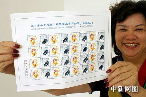 中新江蘇網(wǎng)鹽城8月17日電 (于從文 徐德鈺 李根) 上海吳女士16日來(lái)到江蘇鹽城,展示了以罕見的徐悲鴻畫豬圖為主題的個(gè)性化郵票設(shè)計(jì)效果圖。該連體郵票畫面中,一只火紅的剪紙鳳凰和一只黝黑的國(guó)畫豬相映成趣,給人以獨(dú)特的視覺(jué)感受。目前,這套郵票已經(jīng)交付印刷,將在本月底發(fā)行。