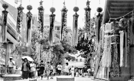 鳥(niǎo)住貞義先生還給我放了一段去年七夕時(shí),枚方市祭掃“七夕神社”的錄像,我看到,前往祭掃的人除了“七夕研究會(huì)”的成員外,還有當(dāng)?shù)氐淖h長(zhǎng)、市府官員以及許多民眾。在“七夕神社”的周圍栽了很多竹子,前往祭掃的大人小孩都將自己的心愿寫(xiě)在一張長(zhǎng)紙條上,然后掛在竹子的枝條上,用來(lái)祈福。這使我想起日本小鈞市的“七夕文化”,也牽涉到兒童,“七夕”這天早上,凡年滿6歲的兒童在媽媽的陪同下,到野外的莊稼上取些露水回家,然后用露水磨墨寫(xiě)字。這是一種儀式,代表兒童從這一天起,就開(kāi)始啟蒙讀書(shū)寫(xiě)字了。據(jù)我考證,這是日本和中國(guó)“七夕文化”略有不同的地方,其他如七夕夜放河燈,為牛郎與織女照明祝福;一家人在庭院里擺上桌子,沏上香茶,一邊品茶一邊觀看牛郎與織女相會(huì)天河的美景;在葡萄架下側(cè)耳傾聽(tīng)牛郎與織女相會(huì)時(shí)的絮語(yǔ);姑娘在絲瓜架下默默地向天上‘乞巧’,盼望自己能像織女那般心靈手巧,這些幾乎是相同的。□文/圖 湯禮春
