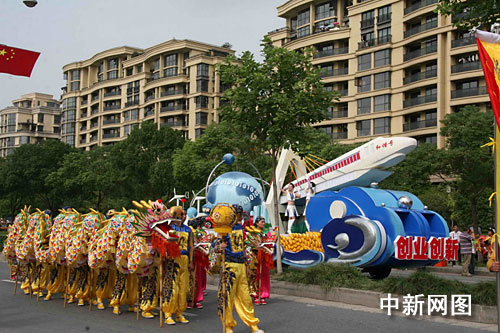 中新網(wǎng)杭州9月26日電(記者 汪恩民 袁爽 實習(xí)生 甘小虎)今天,在“浙江省慶祝新中國成立60周年文藝巡游活動”上,彩車斗艷,浙江各地市紛紛以獨具特色的民間藝術(shù)獻禮祖國六十年壽辰。