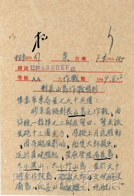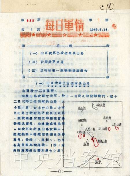 長山列島位于山東半島與遼東半島之間,扼渤海灣門戶,由南、北長山島等17個島嶼組成。山東半島解放后,退據(jù)長山列島的國民黨軍陸戰(zhàn)第2團等部,破壞漁業(yè)生產(chǎn)和海上交通,妄圖封鎖渤海灣。1949年8月,中國人民解放軍山東軍區(qū)指揮進行解放長山列島的作戰(zhàn)。11日晚,第24軍第72師和警備第4、第5旅分別從蓬萊縣劉家旺、欒家口、解宋營起渡。12日凌晨,警備第4、第5旅攻占長山列島兩翼大小黑山島、大小竹山島,牽制停泊在南北長山島的國民黨軍艦艇。第72師在友鄰配合下,接近南北長山島,并在炮火掩護下迅速登島,與國民黨守軍展開激戰(zhàn),上午攻占南長山島,下午占領(lǐng)北長山島。爾后以警備第5旅為主,向砣磯島、大小欽島、南北皇城島發(fā)展進攻。至20日,國民黨守軍殘部棄島逃遁,人民解放軍收復了國民黨軍隊占領(lǐng)的大小島嶼,殲國民黨軍15OO余人,山東省全境解放。
