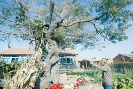 記者轉(zhuǎn)頭望去,金色的陽(yáng)光灑滿綠色的庭院,庭院中央,一棵四人合抱的大槐樹(shù)矗立著,盡管近一半的樹(shù)干被燒毀,但另一半仍然枝繁葉茂,給庭院提供一片滋潤(rùn)的樹(shù)陰。那位村民說(shuō),這棵神樹(shù)遭雷劈過(guò),不過(guò),神樹(shù)數(shù)次逢兇化吉。