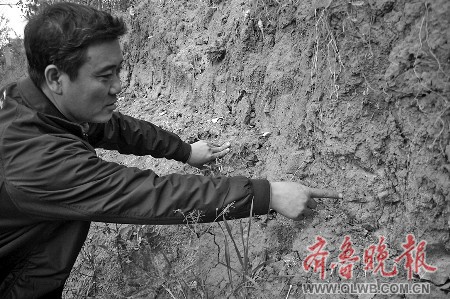 11月21日,跟著宮德杰,記者來到臨朐縣東上林村,從1米到3米不等高的河邊臺(tái)地?cái)嘌轮校浾呖吹搅瞬簧俦毙廖幕z址。宮德杰說,遺址大多位于東上林村東南的河邊臺(tái)地上。遺址西南部斷崖處暴露有文化層、灰坑、墓葬、壕溝、紅燒土等遺跡遺物。由斷崖觀察,北辛文化層厚約0.5至2米不等。