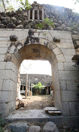 石堡是一個長方形建筑,長37米、寬31米,墻體內外全是用鵝卵石及條石砌成,歷經數(shù)百年風雨,雖說已經沒有了屋頂,只留下高約8米的墻基,但依然雄偉屹立。石堡的三面是護厝房,外墻也是石頭,但內墻是由土夯成的,非常牢固,石堡大門上陰刻“懷珠”兩字。