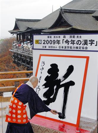 中新社東京十二月十一日電 日本十一日在京都著名古剎清水寺公布慣例的“今年的漢字”評選結(jié)果,“新”字當(dāng)選為描繪二00九年的世象“代言人”。