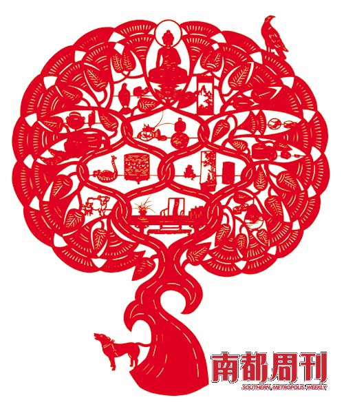 袁荃猷女士刻的這幀“大樹(shù)圖”剪紙,形象勾畫(huà)出了王世襄一生的15種愛(ài)好,這其中有代表王世襄最主要學(xué)術(shù)成就的漆器,還有王世襄使之死而復(fù)生的傳統(tǒng)工藝竹刻、葫蘆器,還有繪畫(huà)、鎏金銅佛像、蟋蟀、家常菜、大鷹、獾狗等。