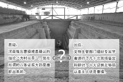 對于學(xué)者質(zhì)疑,河南省文物局副局長、新聞發(fā)言人孫英民進行了回應(yīng)。他表示,曹操陵墓本身爭議很大,河南省文物局對于曹操陵墓的確認和發(fā)布非常慎重——從2009年10月開始發(fā)現(xiàn)有證據(jù)表明可能為曹操陵墓后,國家文物主管部門先后組織了歷史學(xué)、考古學(xué)、古文字學(xué)、人骨鑒定方面專家學(xué)者,進行了幾十次現(xiàn)場鑒定和研究討論,最后得出的結(jié)論是,目前掌握的六大證據(jù),足夠確認墓主人就是曹操。河南省文物局根據(jù)專家意見,報經(jīng)國家文物局同意之后,對外統(tǒng)一發(fā)布了曹操陵墓確認的消息,整個過程是嚴謹和慎重的。