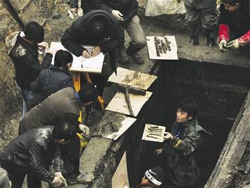 昨日上午10時(shí)許,工作人員從槨室內(nèi)的淤泥中清理出幾片器物,吸引了眾人的目光。經(jīng)現(xiàn)場(chǎng)考古專(zhuān)家證實(shí),這是兩枚珍貴的竹簡(jiǎn),由于年代久遠(yuǎn),墓室內(nèi)的結(jié)構(gòu)和環(huán)境又遭破壞,竹簡(jiǎn)異常脆弱。工作人員隨即將竹簡(jiǎn)嚴(yán)密包裹起來(lái)。由于槨室內(nèi)的淤泥和積水較多,竹簡(jiǎn)的數(shù)量和簡(jiǎn)上文字內(nèi)容尚不得而知。
