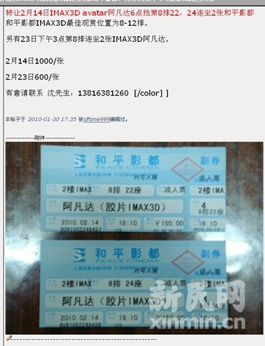 2月14日阿凡達(dá)IMAX票已炒至1000元!和平影都2月影票自1月29日開售起,便掀起新一輪購票狂潮。新民網(wǎng)記者近日在各大論壇及購物網(wǎng)站上看到,2月份影票大多已飆至500元,2月14日晚6點(diǎn)場次已炒至1000元。對此,和平影都總經(jīng)理王伯政表示:“‘黃!坏昧耍@也不是我能管的!