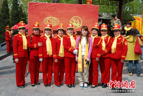 大典進(jìn)行時,各項準(zhǔn)備工作就緒,拜祖場務(wù)人員在拜祖現(xiàn)場等候各項議程的工作安排,他們“忙里偷閑”和中新網(wǎng)直播主持人合影留念。參加放飛和平鴿的兩岸四地的小朋友們靜靜坐在亭子里等候。