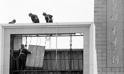 上午8時(shí)許,記者在人民英雄紀(jì)念碑前看到,工人正在組裝放置孫中山先生畫(huà)像的背板相框,并且將相框整體加固。