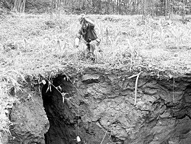隨著“轟”的一聲巨響,硐底鎮(zhèn)石埡村“大彎頭”出現(xiàn)了一個(gè)巨大的坑。巨響后是持續(xù)十多秒的“嘩嘩”聲,那是地層塌陷后,沙石滑到坑底的聲音,每一聲都讓人發(fā)抖、發(fā)冷。