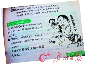 5月6日,芙蓉姐姐在微博上自爆,她由朋友處得知自己被印到了單詞本上做配圖。芙蓉姐姐在微博上寫道:“早晨上網(wǎng)時(shí),朋友發(fā)給藕一張圖,說是單詞本上的,這個(gè)舉例也太壯觀了吧……”芙蓉姐姐還發(fā)了圖片,記者看到其漫畫像被用于詮釋英文單詞“spectacular”(壯觀的、引人注目的)。至記者發(fā)稿時(shí)止,該微博被400多人轉(zhuǎn)載,有200多網(wǎng)友對(duì)此發(fā)表評(píng)論。