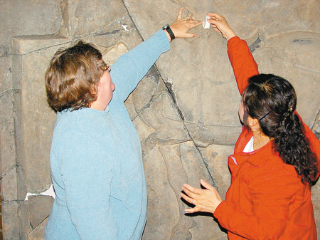 賓夕法尼亞大學博物館首席文物保護專家琳·格蘭特女士這兩天很興奮,一是中國文物修復專家的到來,帶來了東方文物修復理念,二是中國專家?guī)淼摹罢蚜炅E”殘塊石膏模型,竟與二駿中拳毛騧馬鞍斷裂部分非常匹配。格蘭特女士激動地對記者說:這真是難以置信的成果,“二駿”來到美國快一百年了,它身上掉的另一塊石頭又找到,太讓人高興了。
