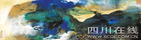 《愛(ài)痕湖》為張大千1968年所作巨幅絹本潑彩,寬76.2厘米,長(zhǎng)264.2厘米,畫(huà)面描繪的是遠(yuǎn)眺瑞士亞琛湖所見(jiàn),與張大千平生巨構(gòu)《長(zhǎng)江萬(wàn)里圖》創(chuàng)作于同年,為張大千《愛(ài)痕湖》系列中最精彩、尺寸最大的一幅。該作品于20世紀(jì)60年代曾獲展于紐約、波士頓、芝加哥等地的著名畫(huà)廊,2003年又獲展于紐約大都會(huì)博物館《兩種文化之間》大型中國(guó)現(xiàn)代藝術(shù)展,是藝術(shù)史界共認(rèn)的張大千潑彩山水最精彩的作品。畫(huà)面前景為青翠的山巒,后景則一泓湖水,掩映其間,又有淡墨、淡彩勾勒的屋舍。這是張大千化用西方抽象派藝術(shù)與中國(guó)傳統(tǒng)文人藝術(shù)的水乳交融之作,也是以現(xiàn)代的語(yǔ)言,對(duì)北宋雄偉山水的現(xiàn)代性翻譯,不僅是張大千的藝術(shù)臻于化境的象征,也是中國(guó)傳統(tǒng)藝術(shù)最成功的“現(xiàn)代性突圍”。